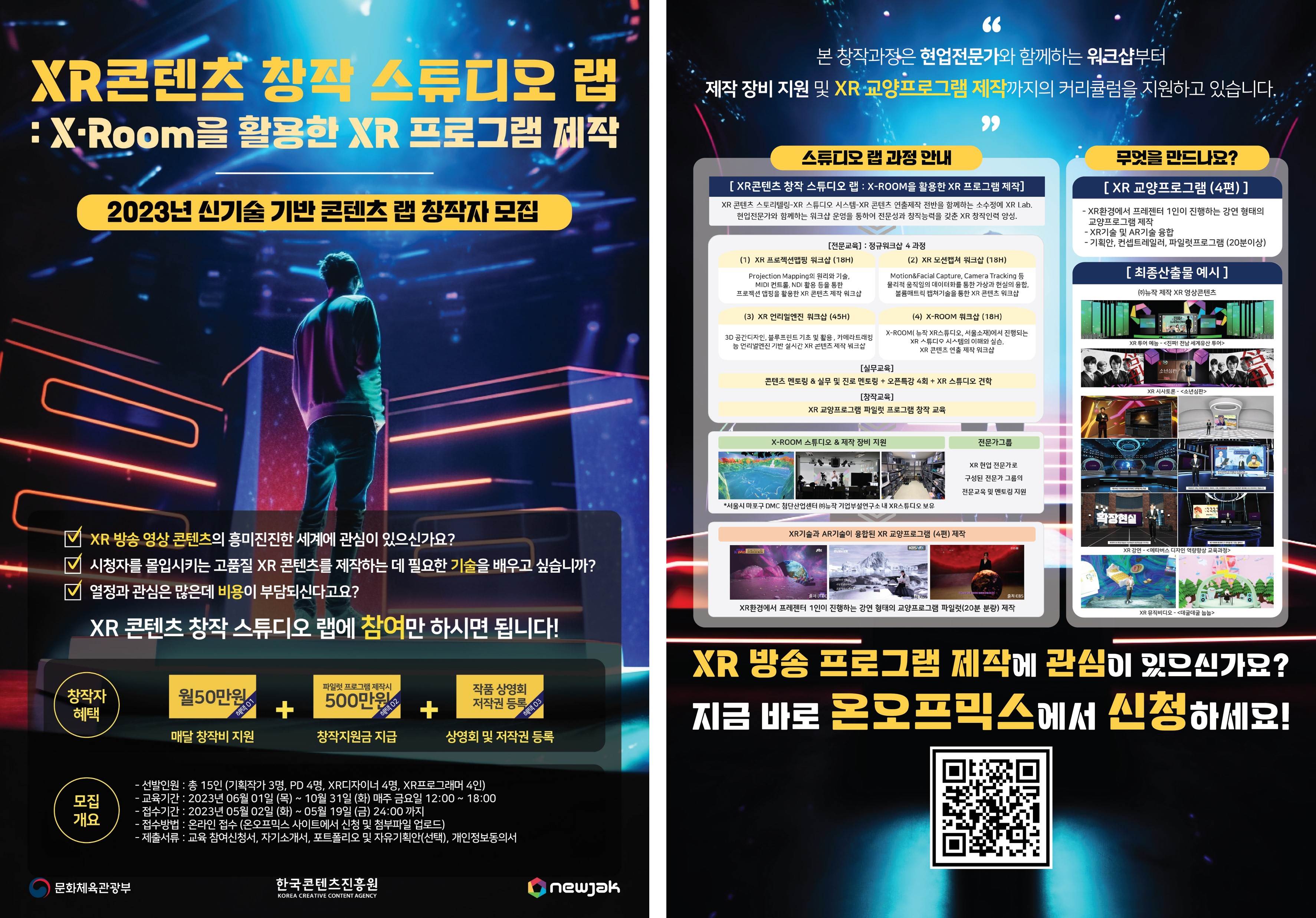 이번 과정은 6월 10월까지 매주 금요일마다 뉴작 XR기업부설연구소 내 스튜디오에서 운영되며 매월 50만원, 프로그램 수료 시 500만원 창작지원금을 지급(최대 750만원까지 지원)한다.